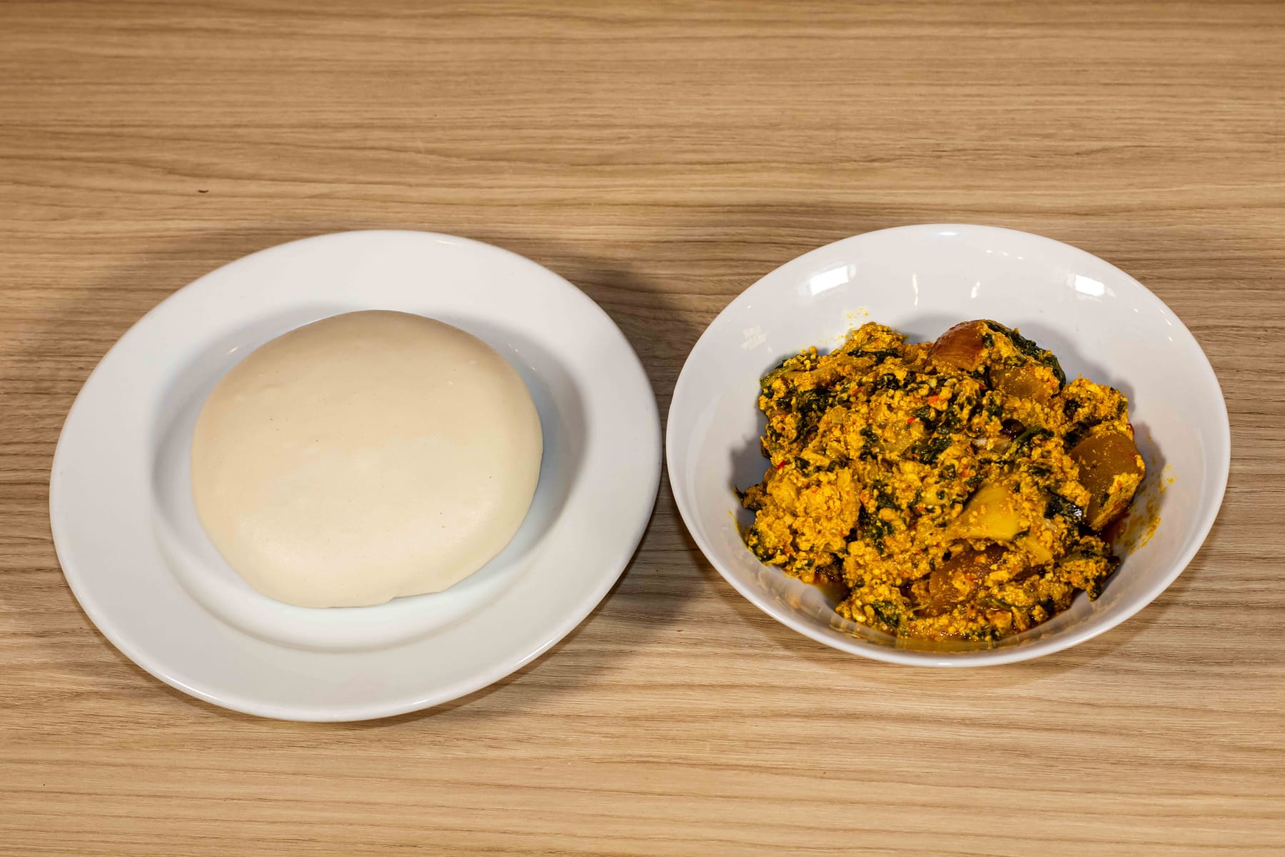 Soft fufu served with rich, hearty Egusi soup made with melon seeds and assorted meats.